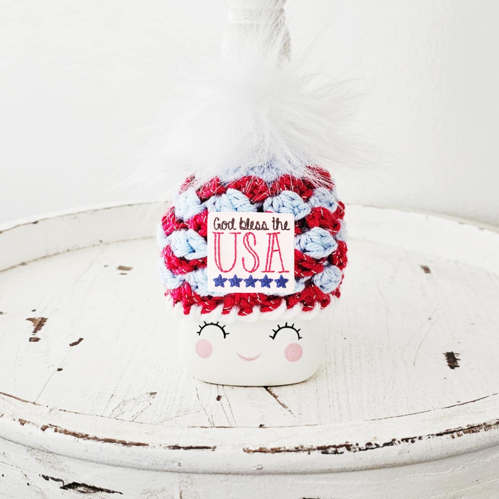 4th Of July God Bless The USA Marshmallow Mug Hat Patriotic Farmhouse Kitchen Tiered Tray Decor Crochet Hat